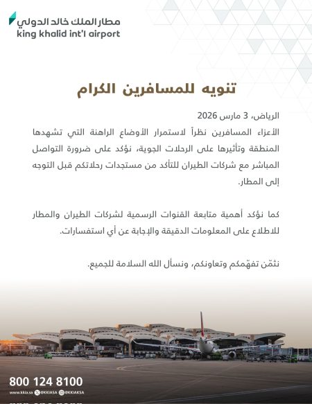 Ayewopò Entènasyonal Wa Khalid la te pibliye yon alèt ijan pou vwayajè yo, pou mande tout pasaje yo pou yo kontakte konpayi avyon yo dirèkteman pou verifye sitiyasyon vòl yo anvan yo ale nan ayewopò a, epi pou yo swiv chanèl ofisyèl yo pou dènye enfòmasyon yo akòz sitiyasyon aktyèl la nan rejyon an.