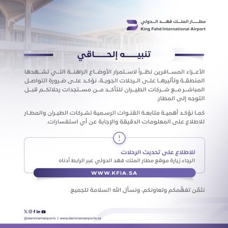 An konsiderasyon devlopman k ap fèt nan rejyon an ak enpak yo sou trafik ayeryen an, jesyon Ayewopò Entènasyonal Wa Fahd la ankouraje tout vwayajè yo pou yo verifye sitiyasyon vòl yo anvan yo vini nan ayewopò a, an previzyon nenpòt chanjman ki ka rive nan lè depa oswa lè arive yo.